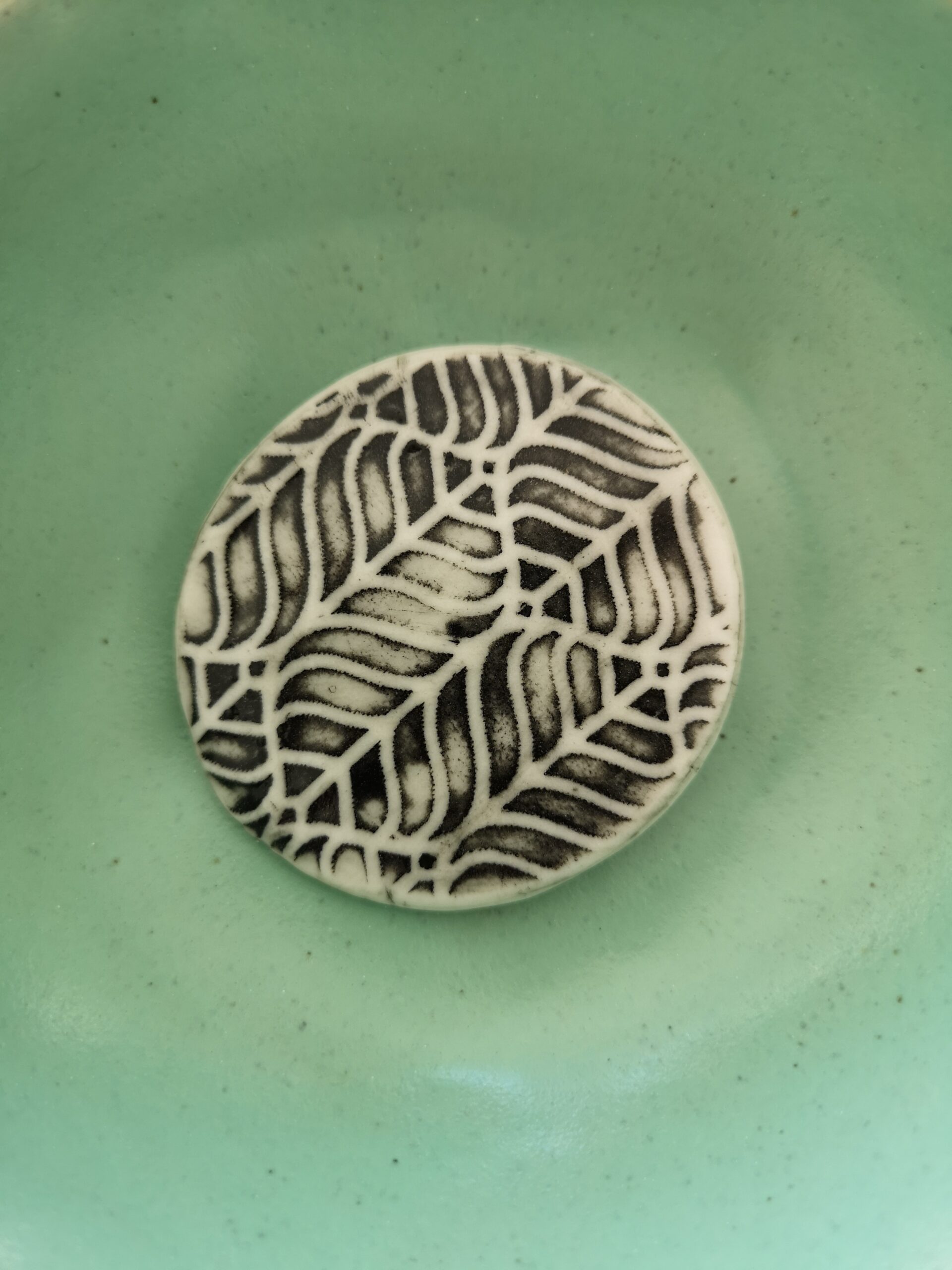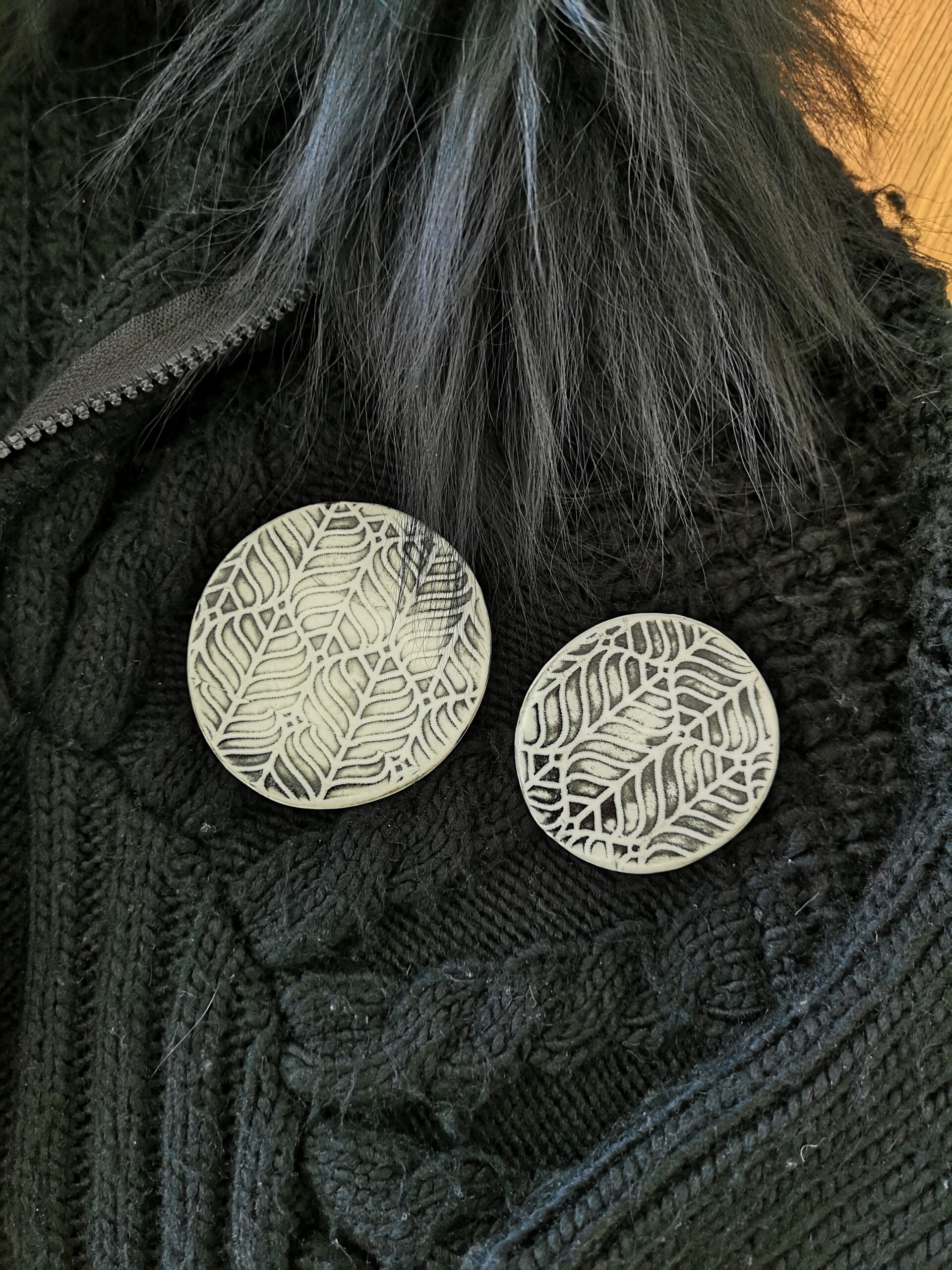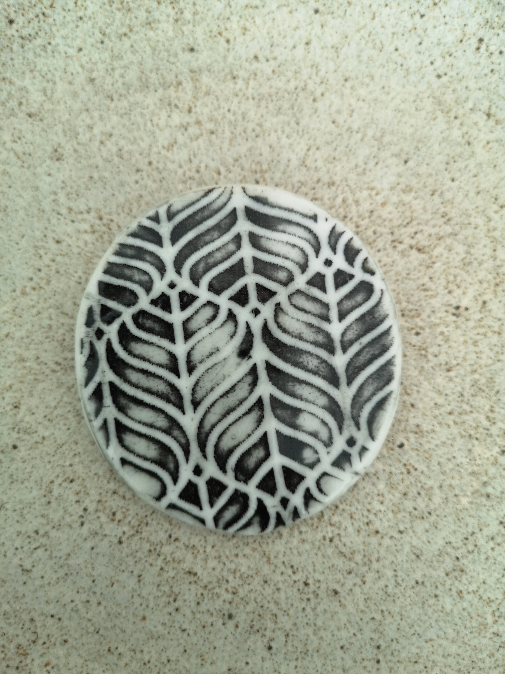 KAGE is a study in shadow – a large oval porcelain brooch in black and white, where texture does the talking and everything else knows its place. The repeated surface pattern evokes the botanical without ever going near a flower.